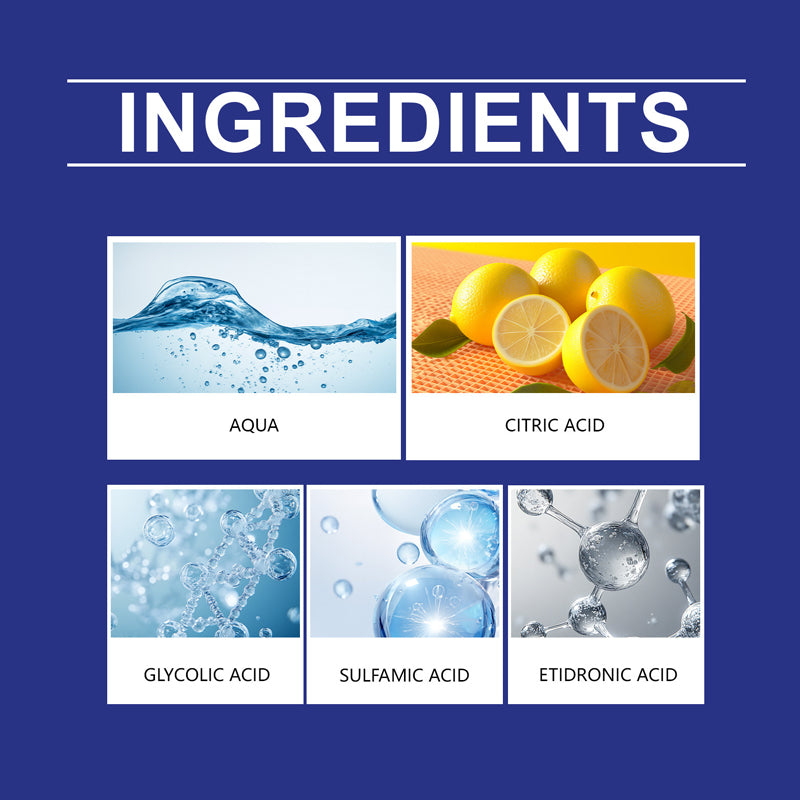Huvudingredienser: Vatten, Citronsyra, Amidosulfonsyra, Glykolsyra, Hydroxyetyliden Difosfonsyra